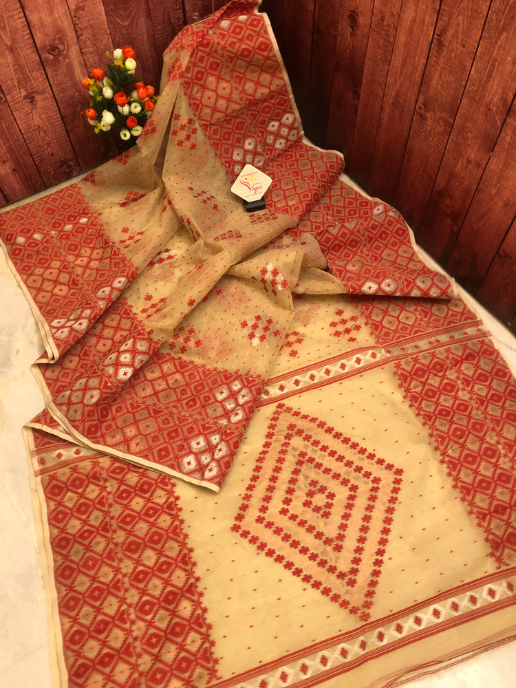 The motifs in Jamdani are usually inspired by nature, featuring flowers, leaves, vines, and sometimes even geometric patterns. The weavers, often working on traditional handlooms, produce these intricate designs by counting each thread meticulously, resulting in a fabric that is lightweight, translucent, and visually stunning.